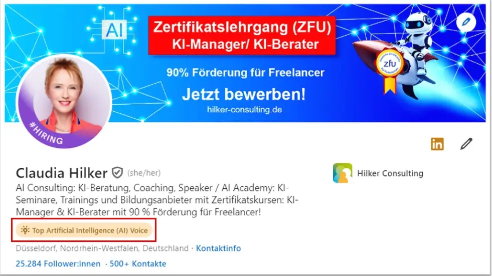 Dazu habe ich für Bitkom das intensive 2-Tage-Seminar entwickelt: Künstliche Intelligenz im Marketing und bekomme dazu gutes Feedback von den Teilnehmer:innen. Außerdem habe ich als Social-Media-Expertin eine große Community mit 100.000 Kontakten aufgebaut. Allein auf LinkedIn habe ich 25.000 Kontakte und gewinne damit etwa 20 qualifzierte B2B-Leads pro Woche. Folge mir auf LinkedIn.